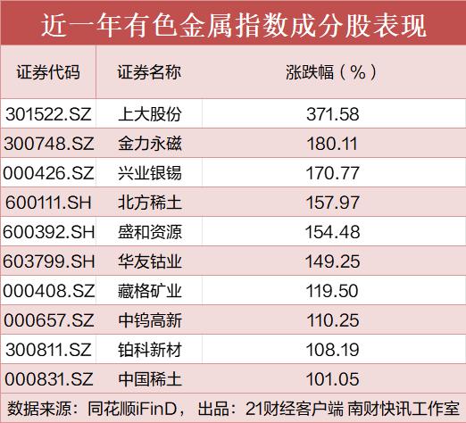 回顾近一年表现,A 股指数有色金属(000819.SH)涨幅为 61.4%,显著跑赢大盘,涨幅排名前 10 的成分股都实现了股价翻倍。