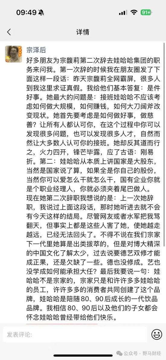 如今宗馥莉第二次从娃哈哈集团辞任,宗泽后再次从朋友圈发表评论。他写道:“尽管网友或者水军把我骂翻天,但事实上都是这些人害了她,使她越走越远,已经无法回头了。不得不说在我们宗家下一代里她算是出类拔萃的,但是对博大精深的中国文化了解太少,过去说要德艺双修才能成正果,还是欠缺了一些。德也没修成。艺也没学成如何能承担大任?最后我要说一句:娃哈哈不是宗家的,宗家只是和许许多多娃哈哈的员工,许许多多的消费者共同创建了这个品牌,娃哈哈是陪随80、90后成长的一代饮品品牌。我相信80、90后以及他们的子女都会怀念娃哈哈曾经带给他们快乐。”